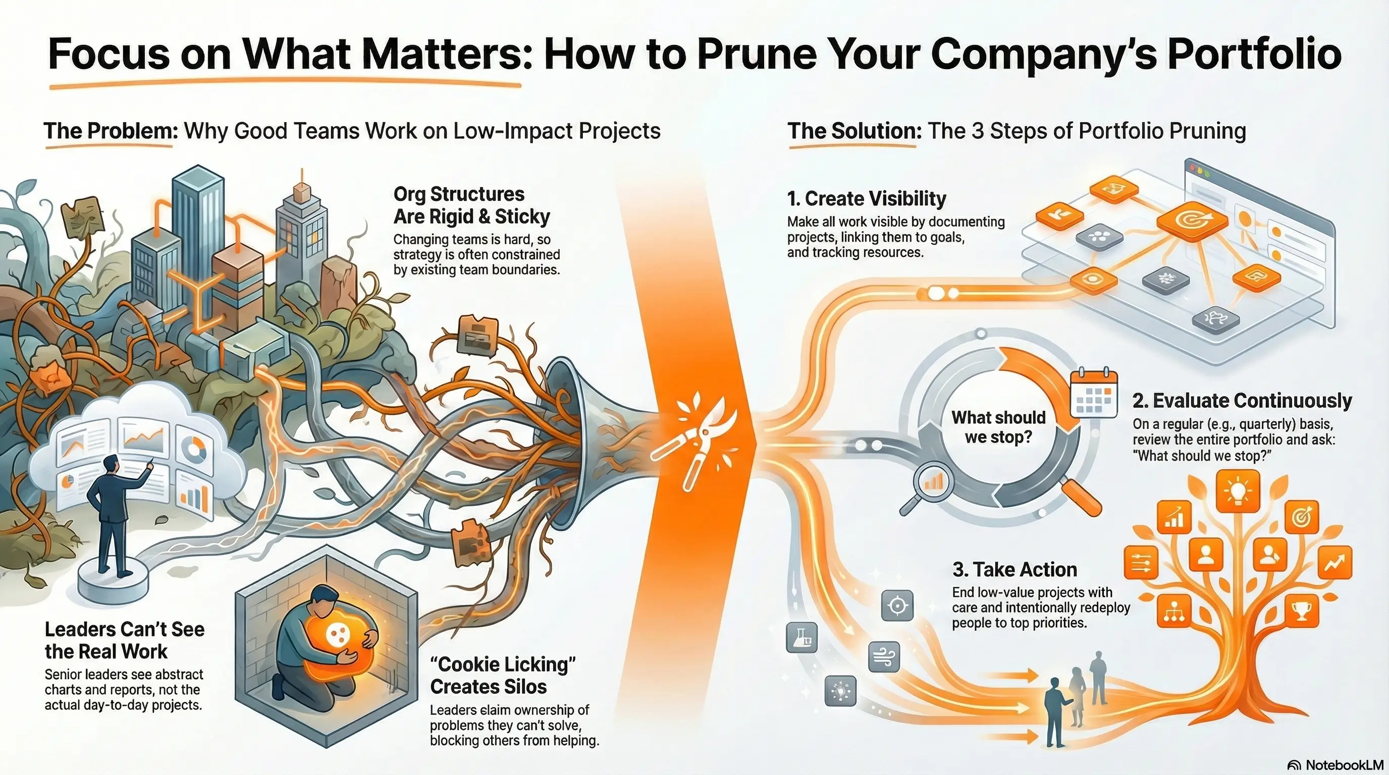 This is why the Alignment Stack and Transparency Principle come first. Build the infrastructure that makes work visible. Link projects to goals and metrics. Create written status that anyone can access. Make it possible to compare work across silos. Then — and only then — does Portfolio Discipline become a strategic discipline rather than a political exercise.