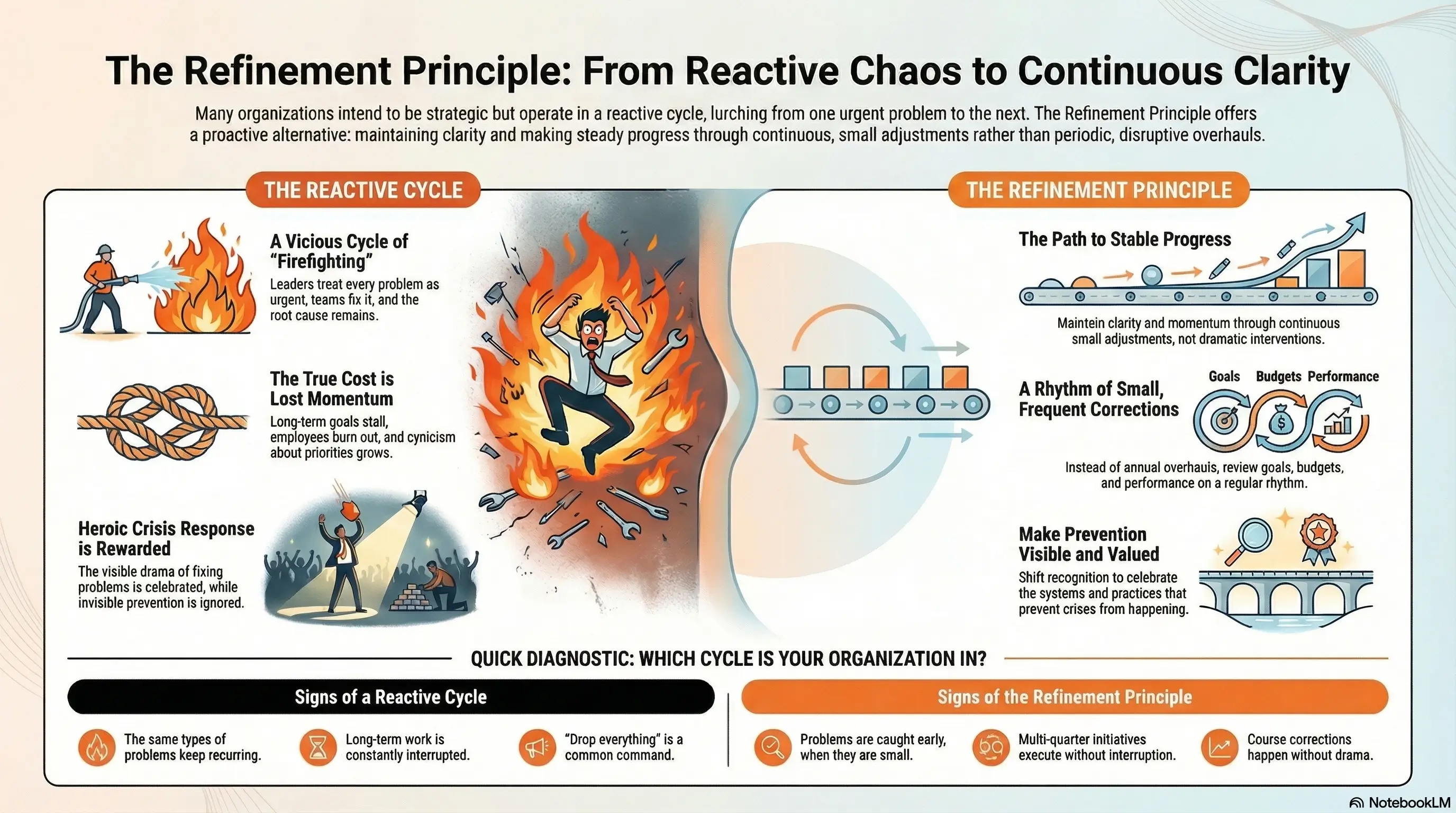The Refinement Principle offers a different approach: maintain clarity through continuous small adjustments rather than periodic overhauls. An organisation that refines constantly - adjusting goals as context changes, addressing small problems before they become large ones, keeping priorities current through regular review - rarely needs to declare emergencies. When something unexpected does happen, the response fits within the normal rhythm rather than derailing it.